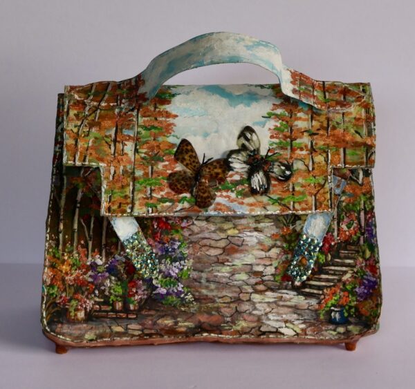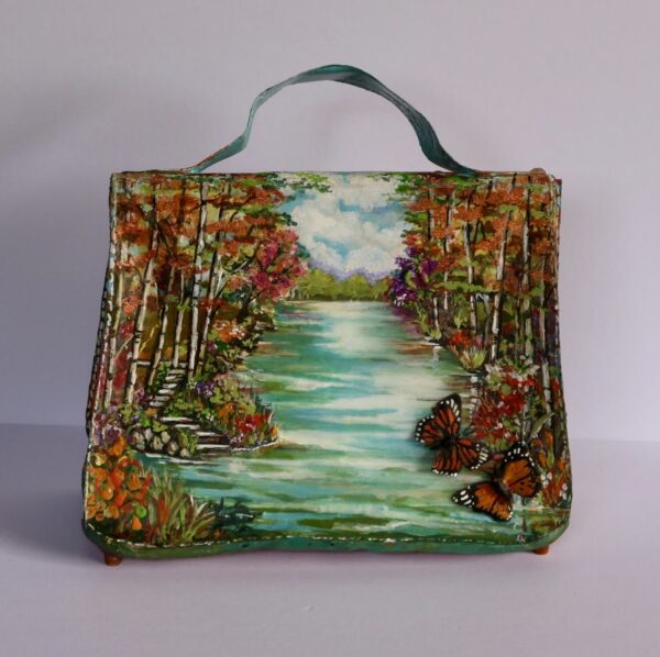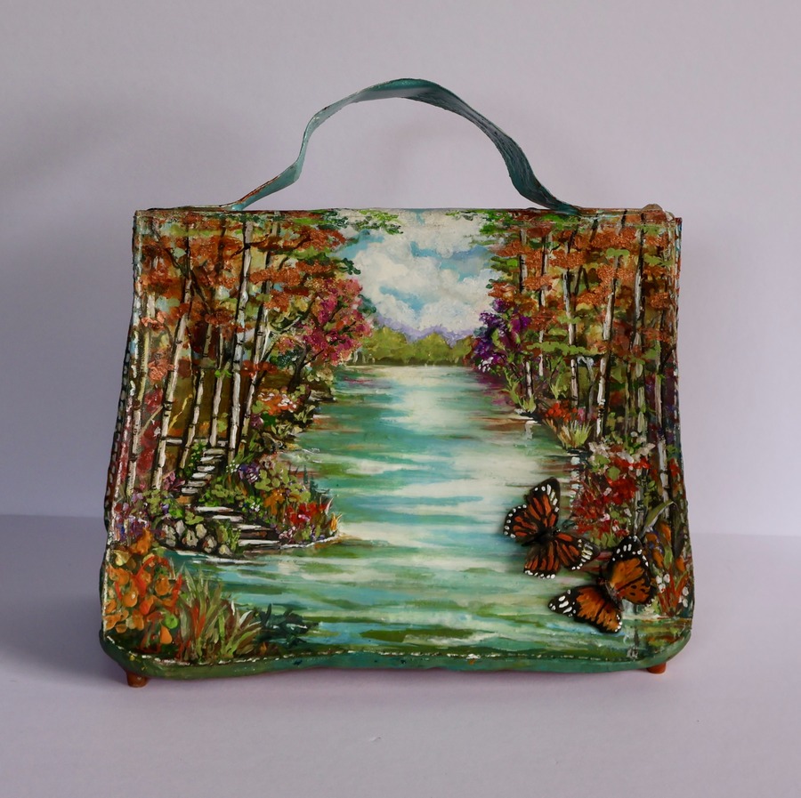 Acrylics on Canvas, Epoxy Resin,Crystals, taxidermy butterflies.Golden metal hardware